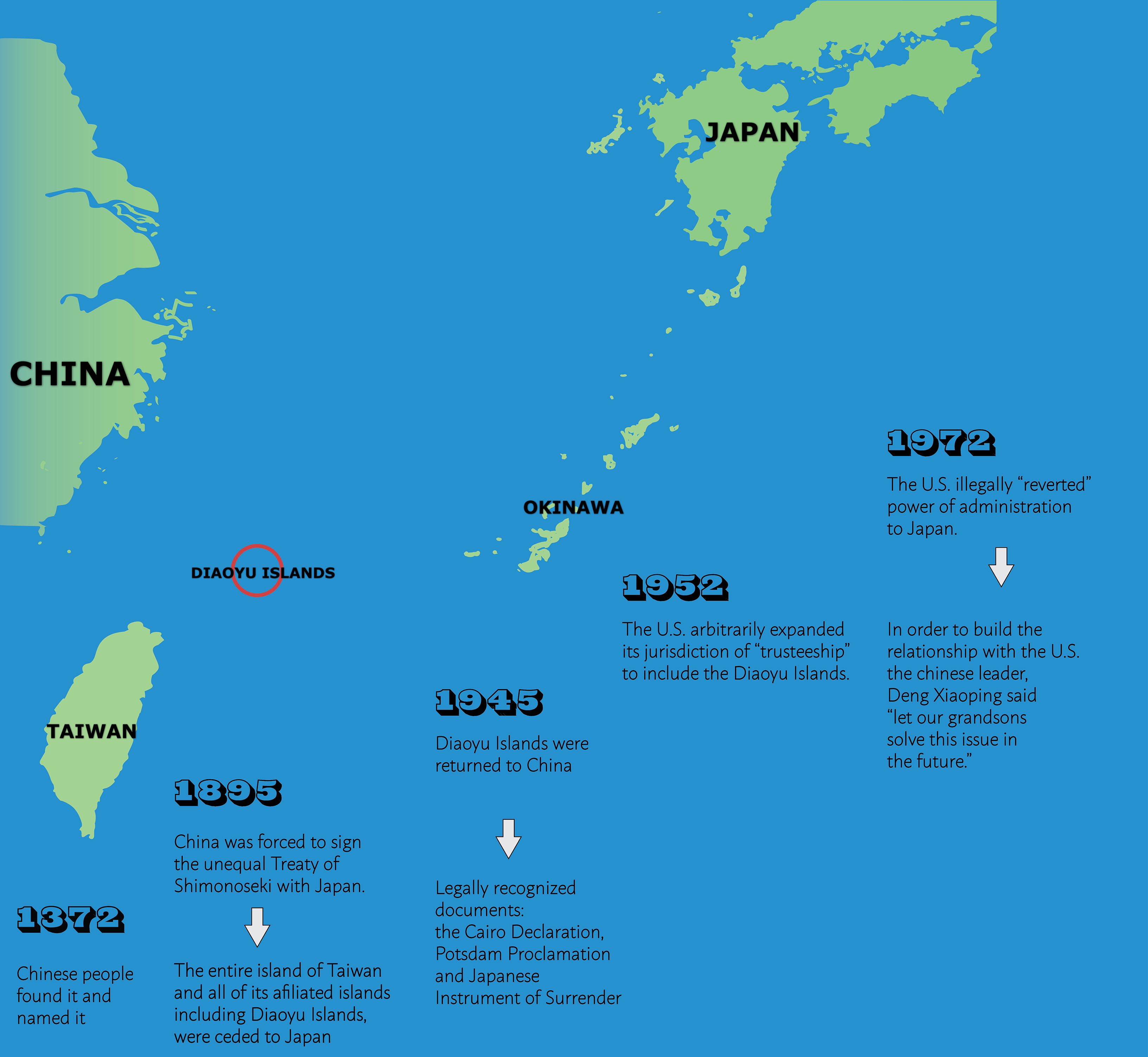 From the beginning of the 1970s, the issue of the sovereignty of the Diaoyu Islands has been the focus of the Sino-Japanese dispute. It gradually developed into a major diplomatic dispute between the two countries when Tokyo Governor Shintaro Ishihara made a speech in April 2012 about the purchase of the Diaoyu Islands. As a world power, the United States, which is allied with Japan, claims that they delivered the “administrative right” of the islands to Japan in 1972 (see above figure.) The speech also highlighted the fact that the U.S. will not choose a side in the dispute. On the other hand, the governor admitted that the US-Japan Security Treaty applies to the disputed islands.