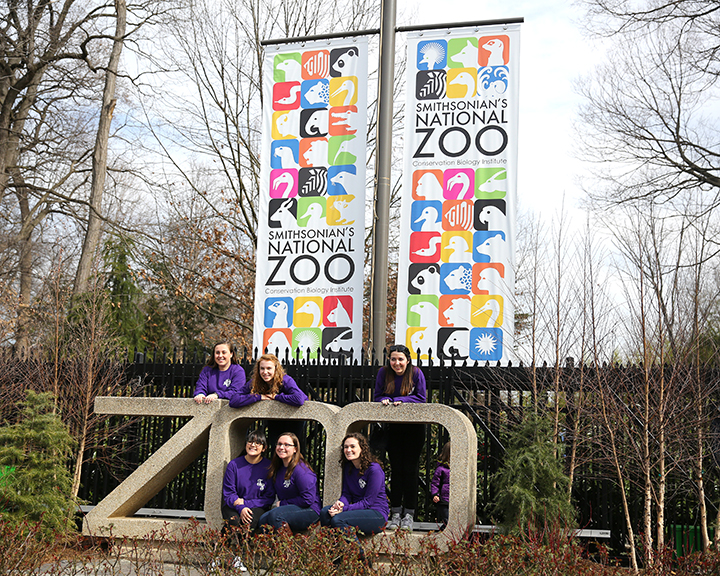 Young girls, who wear same color clothes, are taking photos in front of the entrance of the Smithsonian’s National Zoo on Saturday, Feb. 18, 2017. (Christina Su/American University)