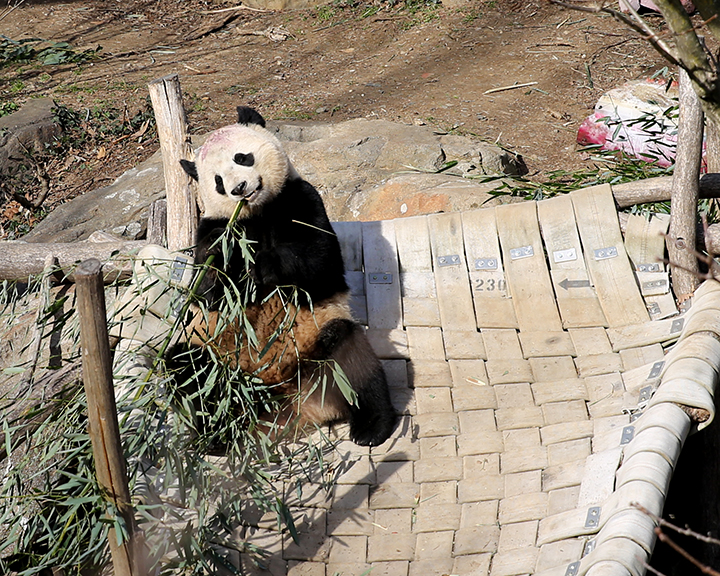 Bao Bao is eating bamboo, sitting on her favorite bed on Saturday, Feb. 18, 2017. According to the Zoo, Bao Bao has 55 pounds of bamboo, 2 pounds of apples, 2 bags of leaf eater biscuits, 2 pounds of sweet potatoes, 10 gallons of water and some sugarcane with her during the flight. (Christina Su/American University)