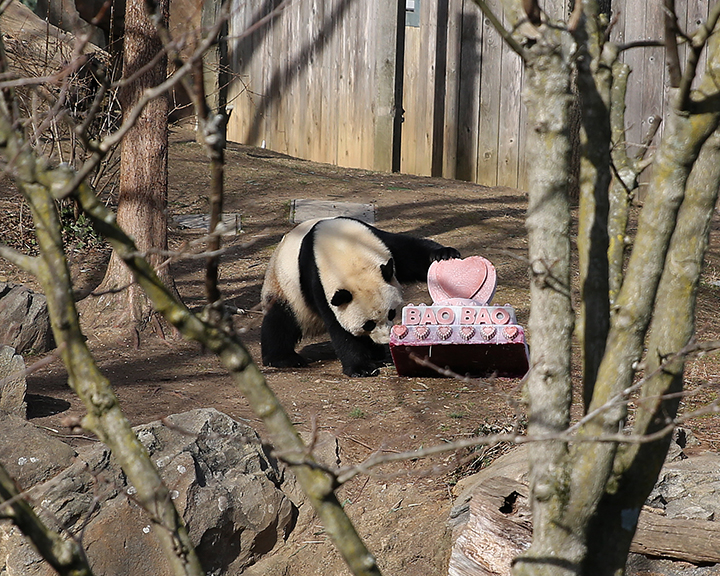 Bao Bao, born at 5:32 p.m. Aug. 23, 2013, is enjoying the heart-shaped ice cake made by the Zoo on Saturday, Feb. 18, 2017. The Zoo holds a series of events to say goodbye to Bao Bao during the long weekend. (Christina Su/American University)