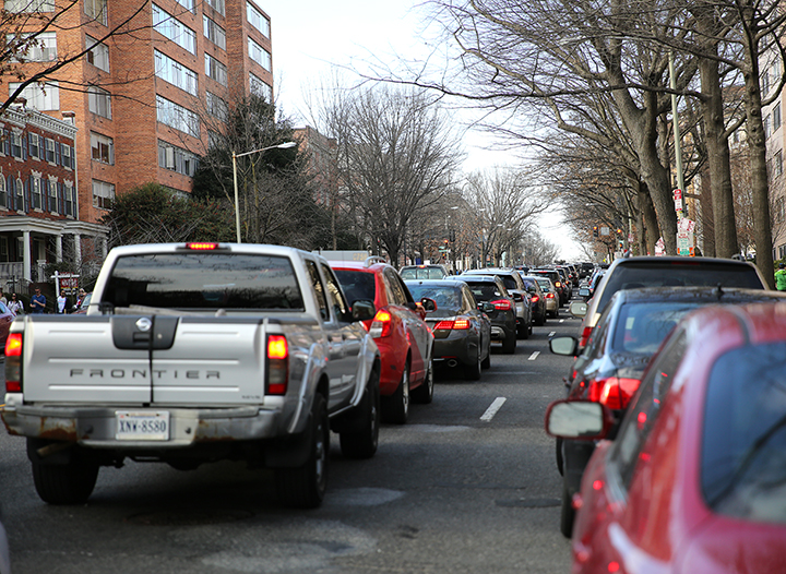 The Connecticut Avenue NW in front of the Smithsonian’s National Zoo is blocked by lots of cars on Saturday, Feb. 18, 2017. Most of them are heading to the Zoo. (Christina Su/American University)